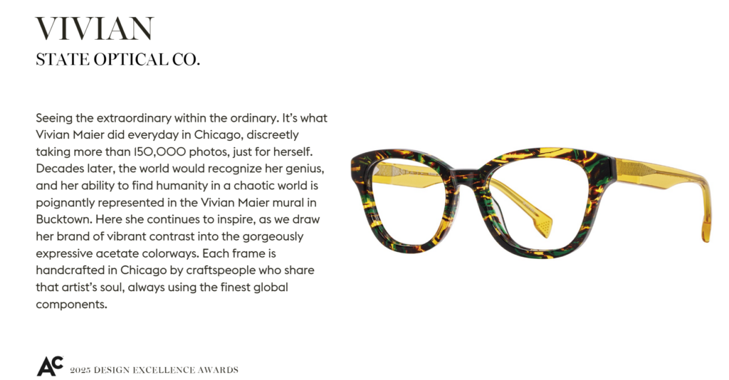 We’re thrilled to share some exciting news: the STATE Optical Co. Vivian frame has been named a finalist in the 2025 Accessories Council Design Excellence Awards, in the Eyewear, Optical (Multi-Brand) category.